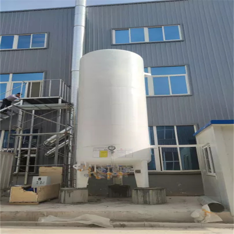 Kriyojenik depolama tankı çift katmanlı silindirik yapıdan yapılmıştır, iç silindir ve boruları paslanmaz çelik S30408'den yapılmıştır, dış kasa alaşımlı çelik Q245R'den yapılmıştır, ara katman genişletilmiş perlit (inci kumu olarak da bilinir) ile doldurulmuştur. ve özel olarak işlenmiş adsorban aynı zamanda ayarlanır.Yüksek vakuma (0,5 ila 6 Pa) pompalanır ve 200 m3 veya daha az kapasiteye sahiptir.Çalışma basıncı yüksektir (dört atölyedeki iki depolama tankının çalışma basıncı 2.0 Mpa'dır) ve tankın dışında, tanktaki basınç artışını şarj etmeyi kolaylaştıran ve doğrudan gönderebilen bir gazlaştırıcı vardır. basınçlı gaz.